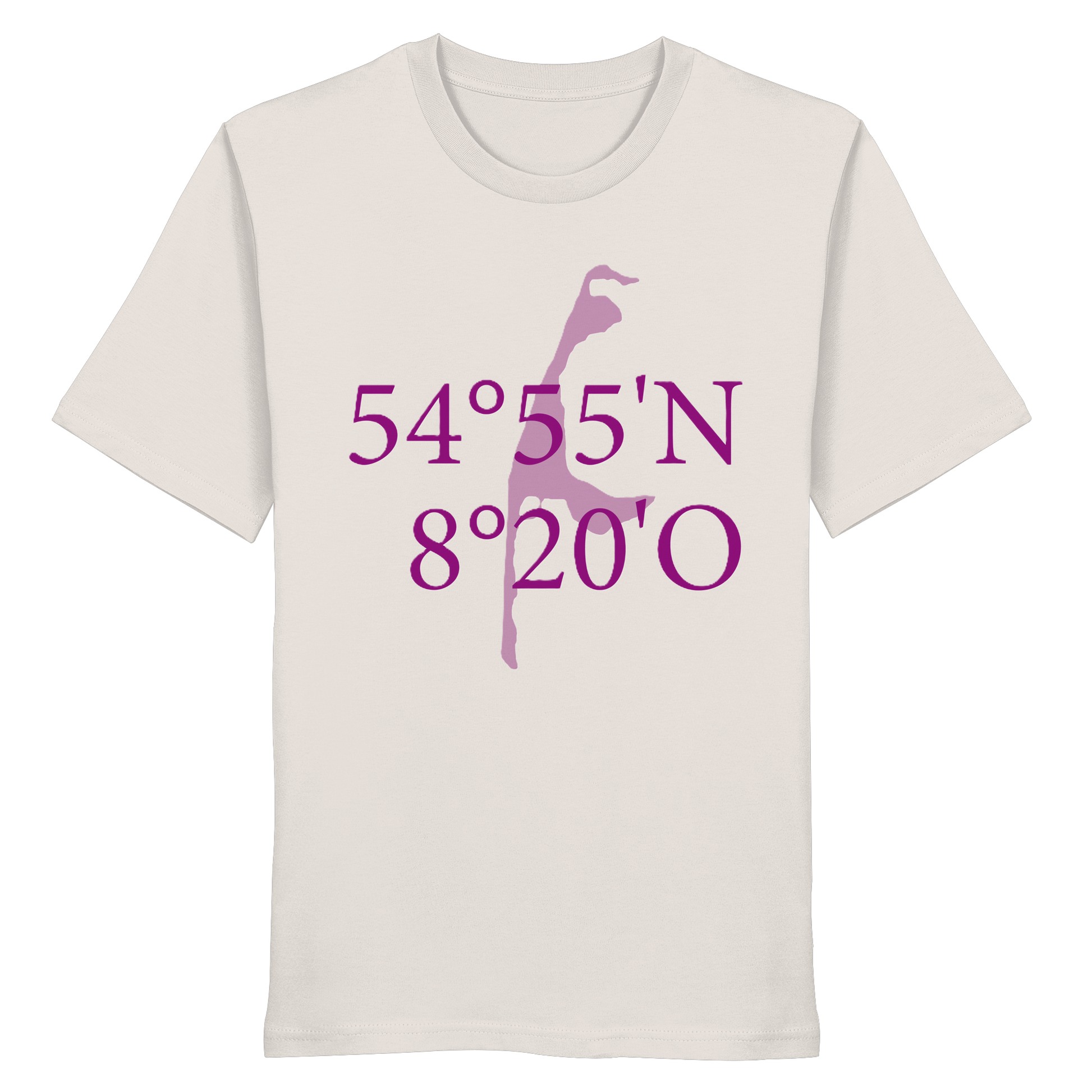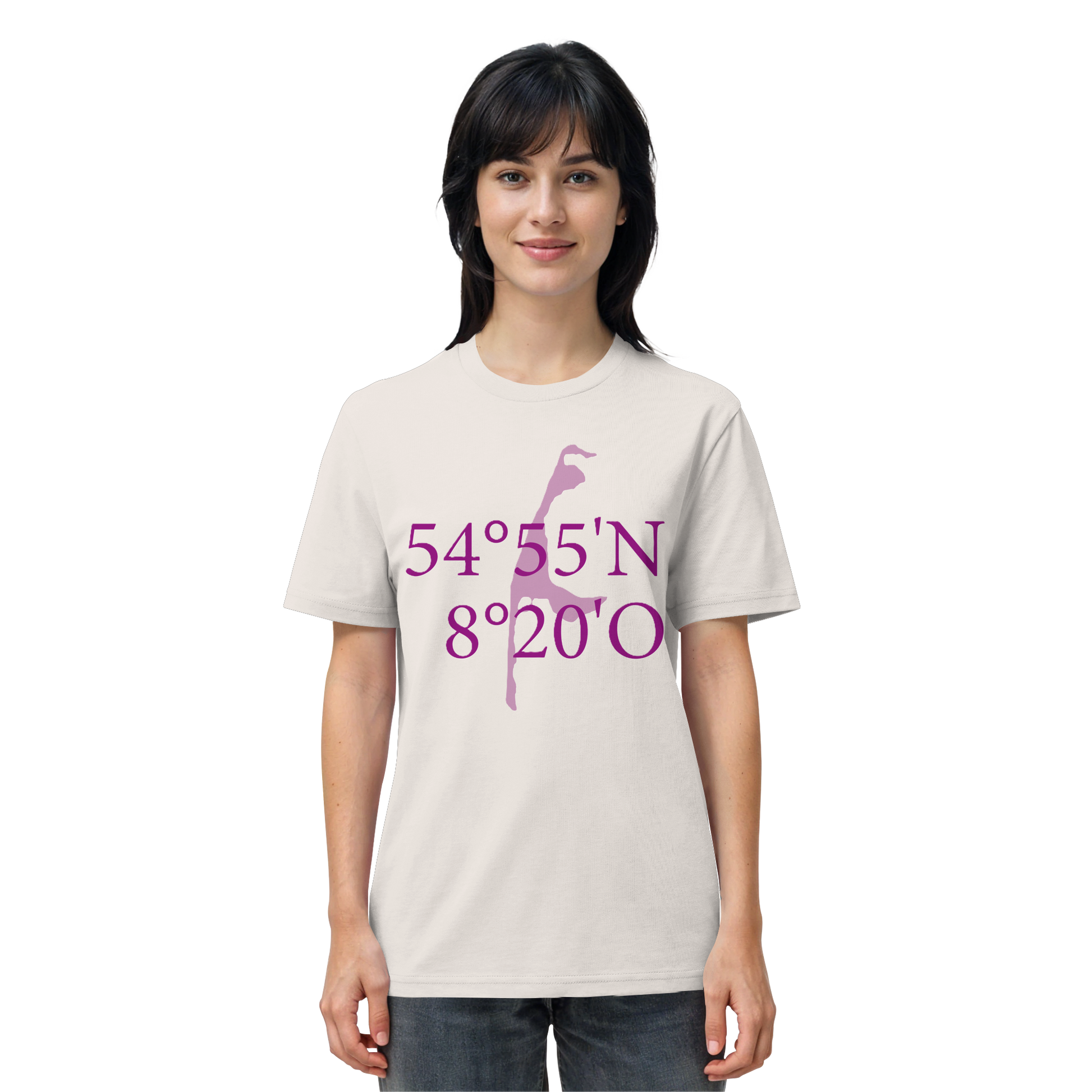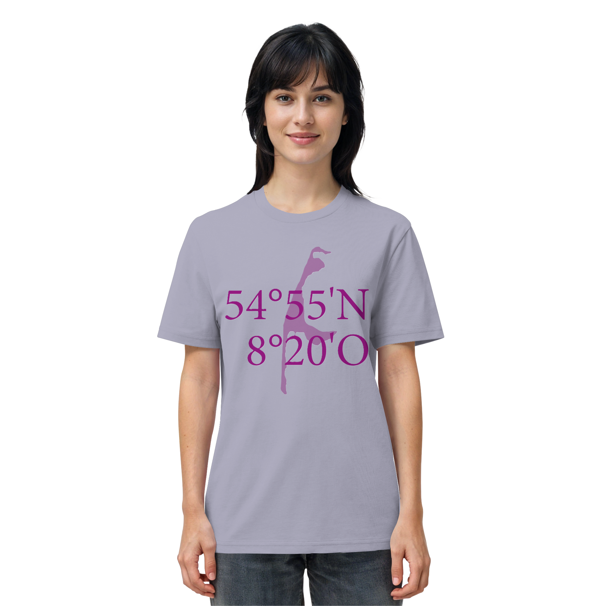 Trage deine Geschichte mit Stolz! Das "Deine Koordinaten - Basic Shirt" verbindet Stil mit Bedeutung. Die markanten Koordinaten und der künstlerische Umriss in kräftigem Violett erzählen von Abenteuern und Erinnerungen.