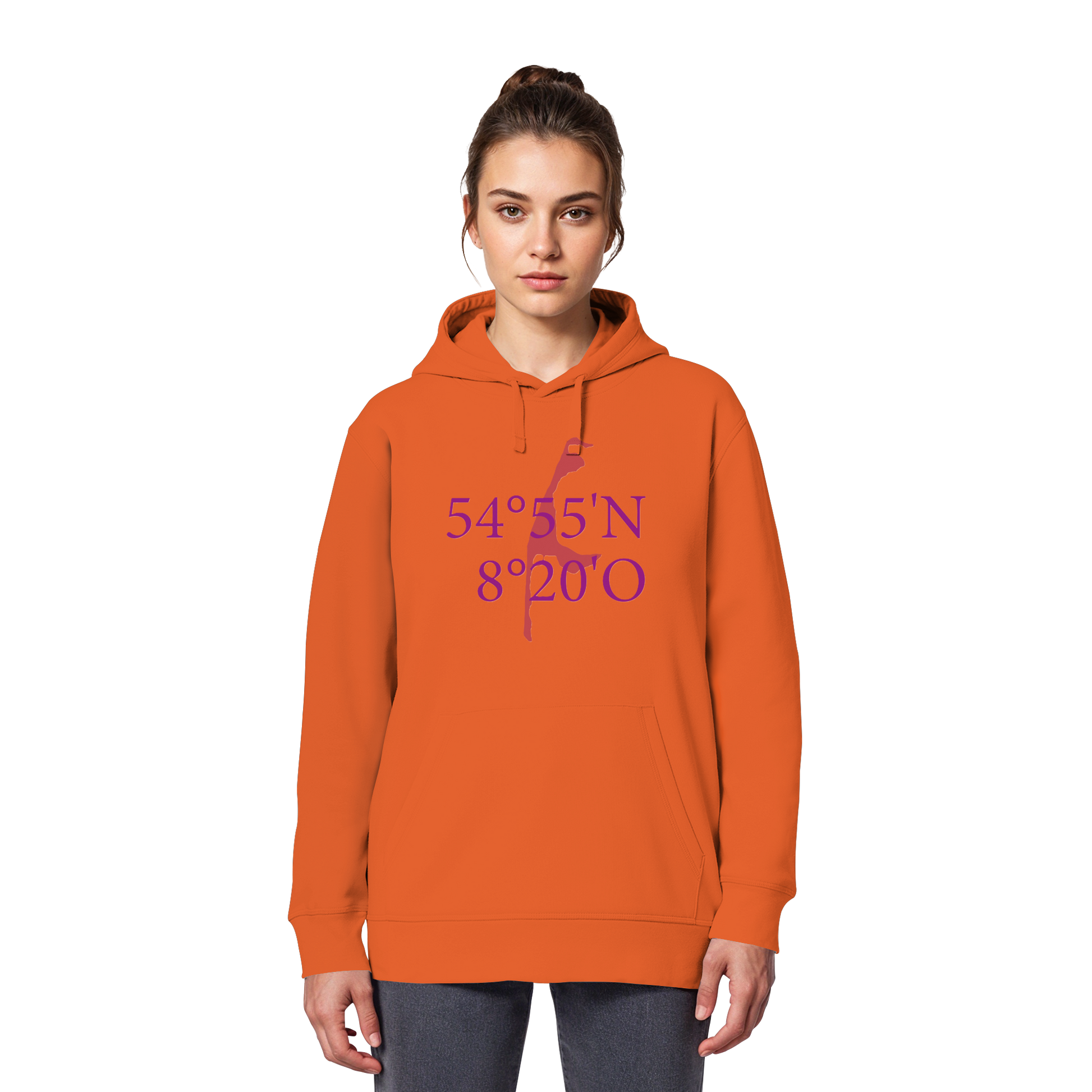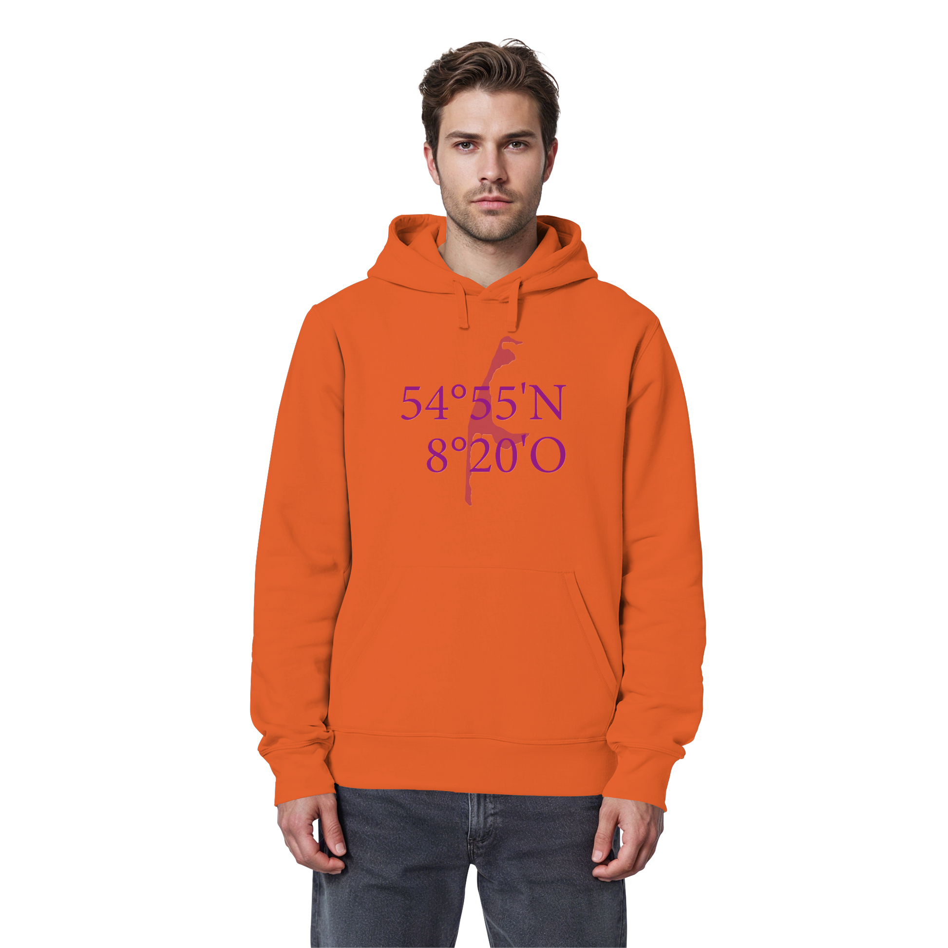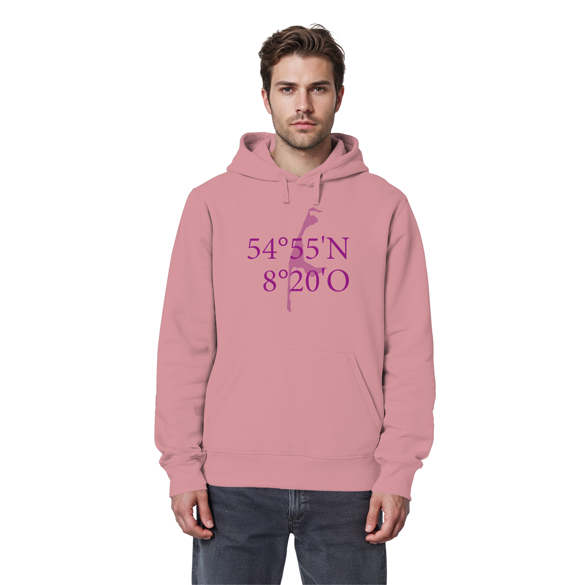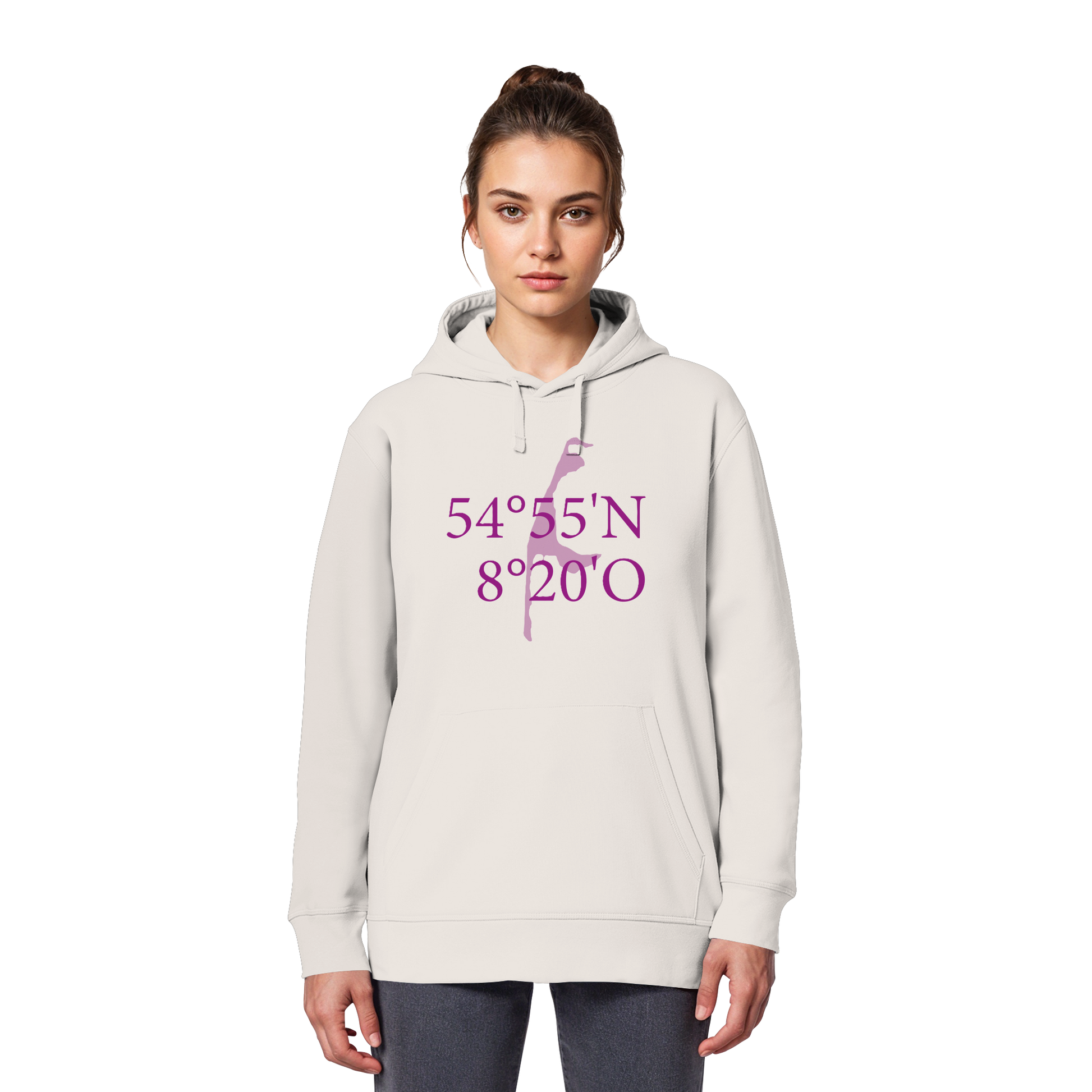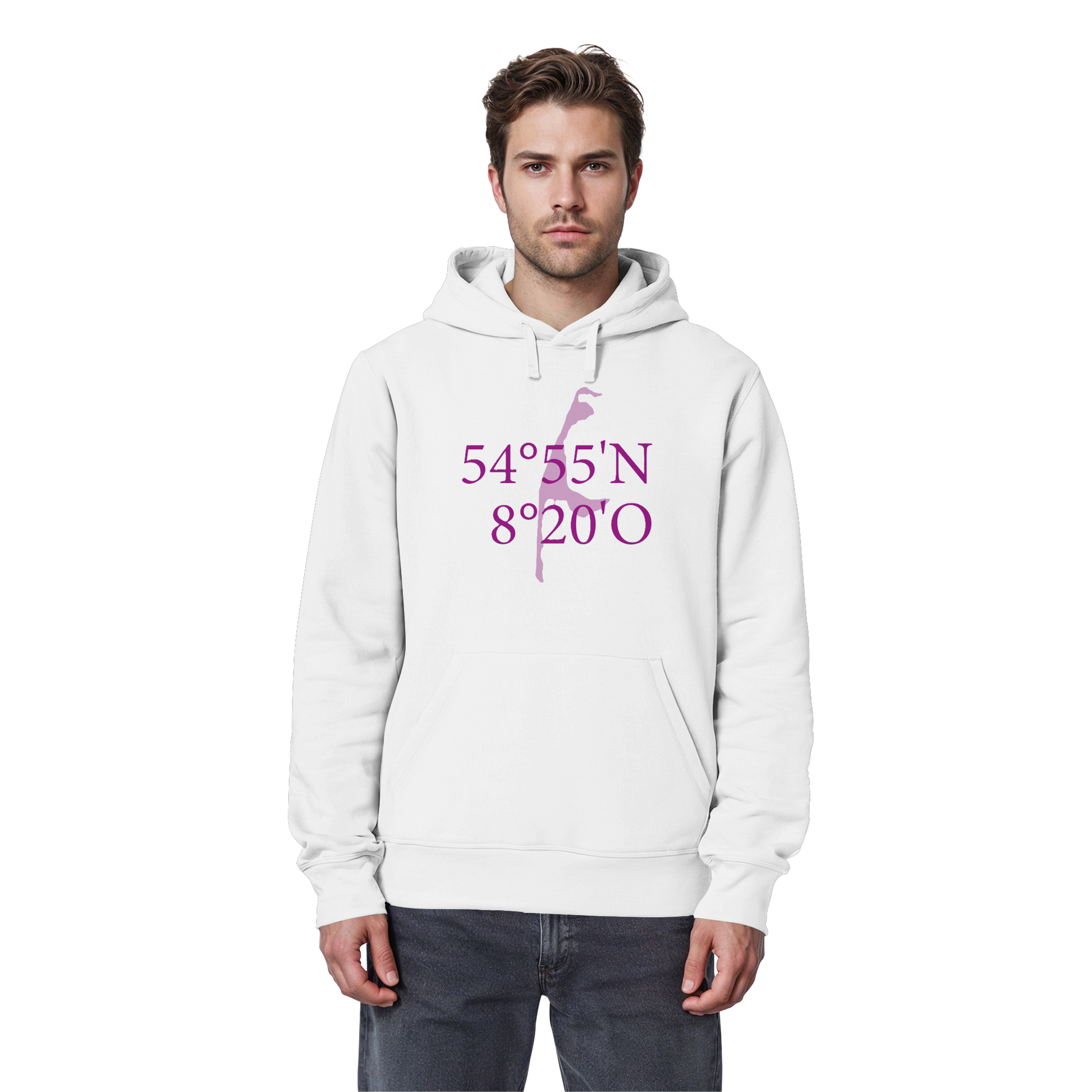 Unser "Deine Koordinaten_lila_vorne - Organic Basic Hoodie" vereint stilvolles Design mit nachhaltiger Produktion. Die auffälligen Koordinaten in sattem Lila symbolisieren Reisen und Abenteuerlust.
