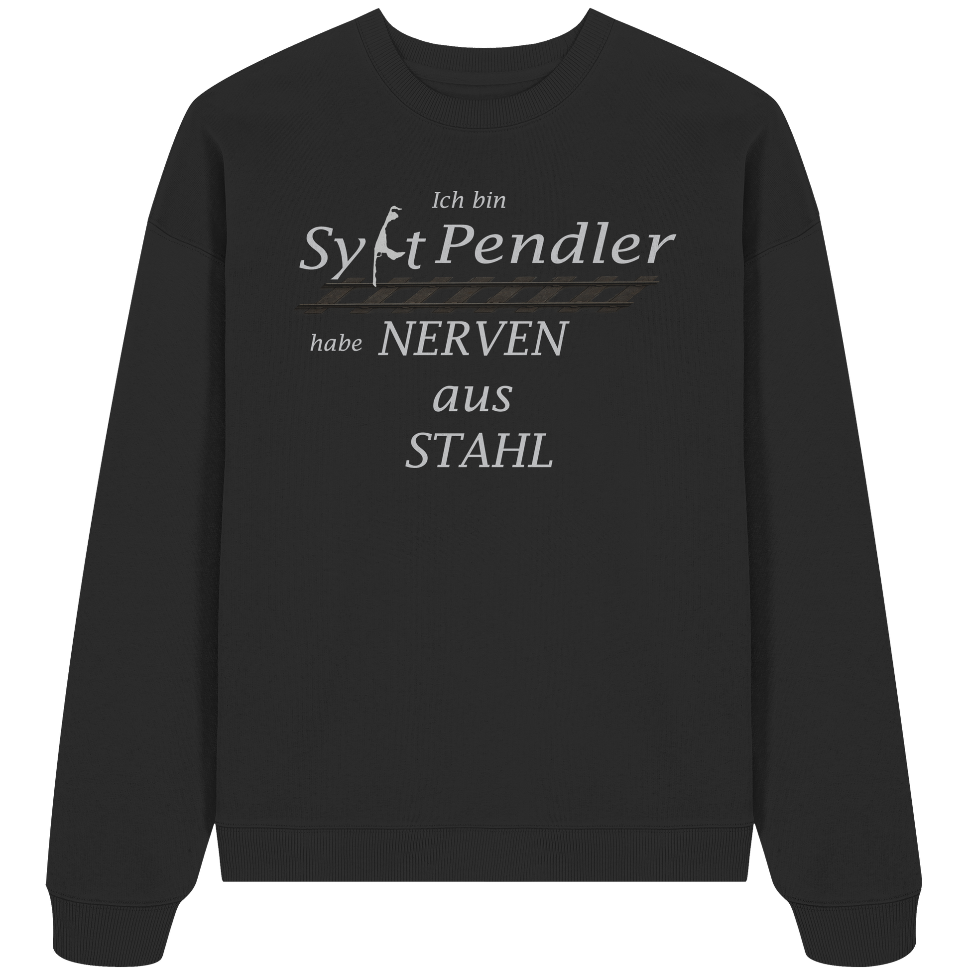Die markanten Motive, kombiniert mit dem Slogan „Ich bin Sylt Pendler, habe Nerven aus Stahl“, zeugen von Stärke und Ausdauer. Die harmonische Farbgebung unterstreicht die zeitlose Eleganz dieses Kleidungsstücks.